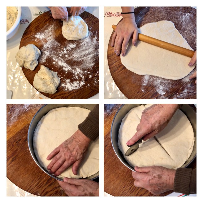 Διαχωρίστε τη ζύμη σε 4 ίσα μέρη. Πάρτε ένα από τα κομμάτια και ανοιξτε το σε περίπου  2 εκ πάχος και μια διάμετρο που είναι το μέγεθος του ταψιού σας. Τοποθετήστε τη ζύμη στο ταψί σας και βουρτσίστε απο πάνω με το ελαιόλαδο. Επαναλάβετε αυτή τη διαδικασία δύο ακόμη φορές, ώστε να καταλήξετε να έχετε 3 στρώματα ζύμης και το ελαιόλαδο να εξαπλωθεί στην κορυφή κάθε στρώματος, συμπεριλαμβανομένης της τελικής κορυφής.
