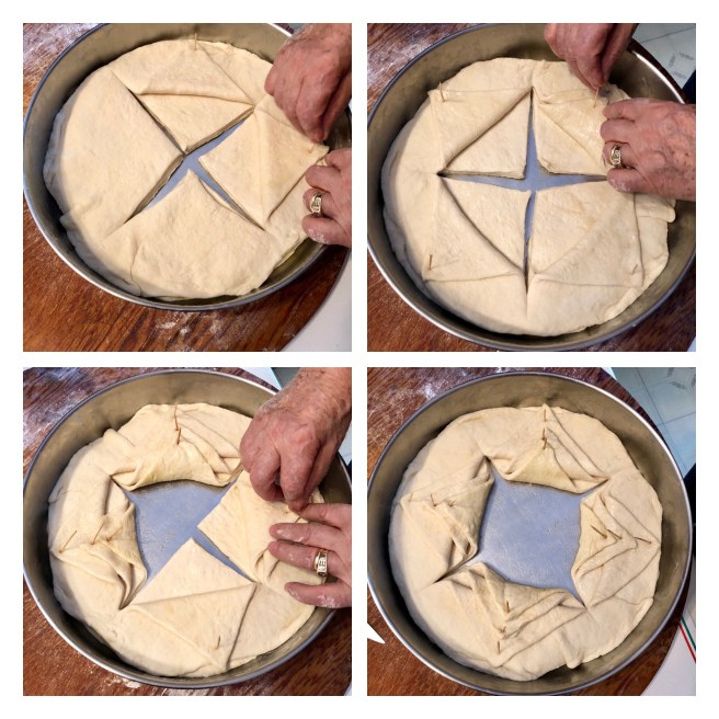 Κάθε στρώμα θα έχει 4 σημεία τραβηγμένα πίσω, και αυτό θα γίνει με όλα τα 3 στρώματα (δείτε τις φωτογραφίες παραπάνω). Θα καταλήξετε με ένα κενό χώρο στο κάτω μέρος του ταψιού σας, ακριβώς στη μέση.