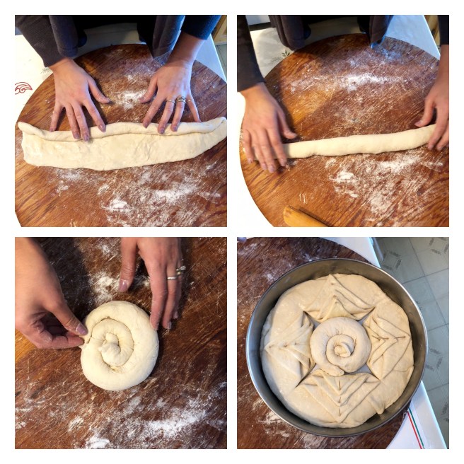 Τώρα είναι καιρός να διαμορφώσετε το χριστόψωμο. Σημειώστε ότι αυτή η ποσότητα ζύμης θα κάνει δύο  χριστόφωμα. Εάν φτιάξετε, τοποθετήστε λίγο φυτικό λάδι στο πάτο των στρογγυλών ταψιων (χρησιμοποιήσαμε ταψιά με διάμετρο 30 εκ) και αφήστε τα στην άκρη.
