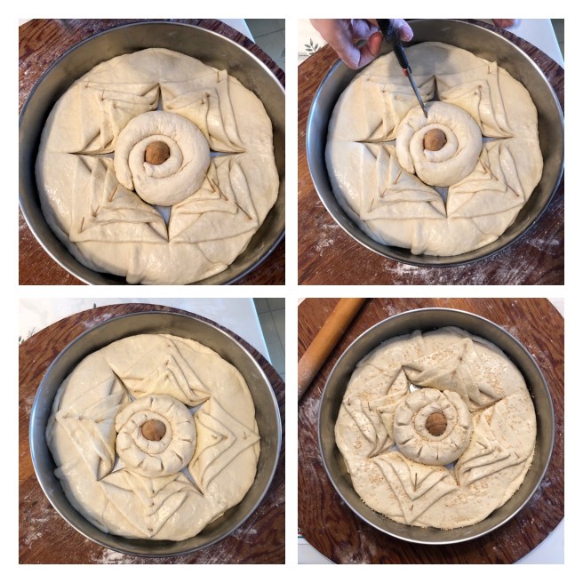 Χρησιμοποιώντας ένα αιχμηρό μαχαίρι, κάντε ένα μεγάλο σταυρό στη ζύμη, κόβοντας τα 3 στρώματα της ζύμης, αλλά ξεκινώντας περίπου 2,5 εκ από τις άκρες (δείτε τις φωτογραφίες παραπάνω).