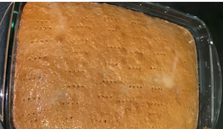 Ψήνουμε την βάση του κέικ στους 180 βαθμούς για μιση ώρα. Ελέγχουμε με την οδοντογλιφίδα ότι είναι έτοιμο και βγάζουμε από το φούρνο και τρυπάμε όλο το κεικ με ένα πηρουνι.
