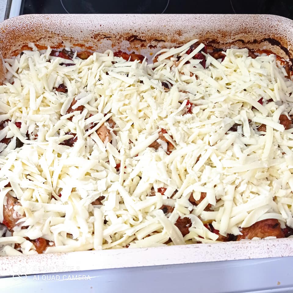 Πασπαλίζω γενναιόδωρα το χοιρινό με λαχανικά με τριμμένο κίτρινο τυρί