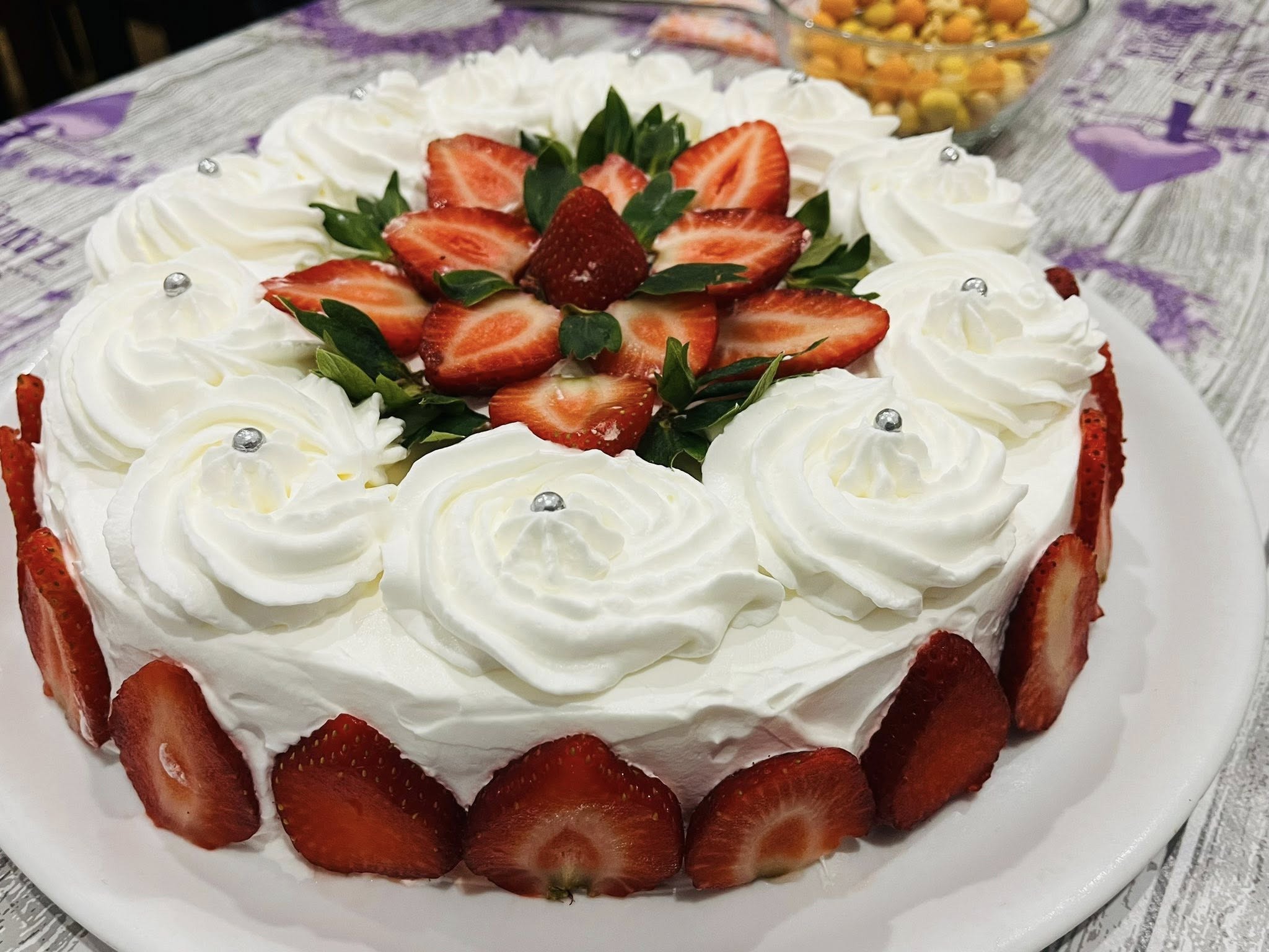 Βάζω τον δεύτερο δίσκο, σιροπιάζω και καλύπτω όλη την τούρτα με σαντιγί. Στη συνέχεια, αφήνω τη φαντασία μου ελεύθερη για τη διακόσμηση με τις υπόλοιπες φράουλες.