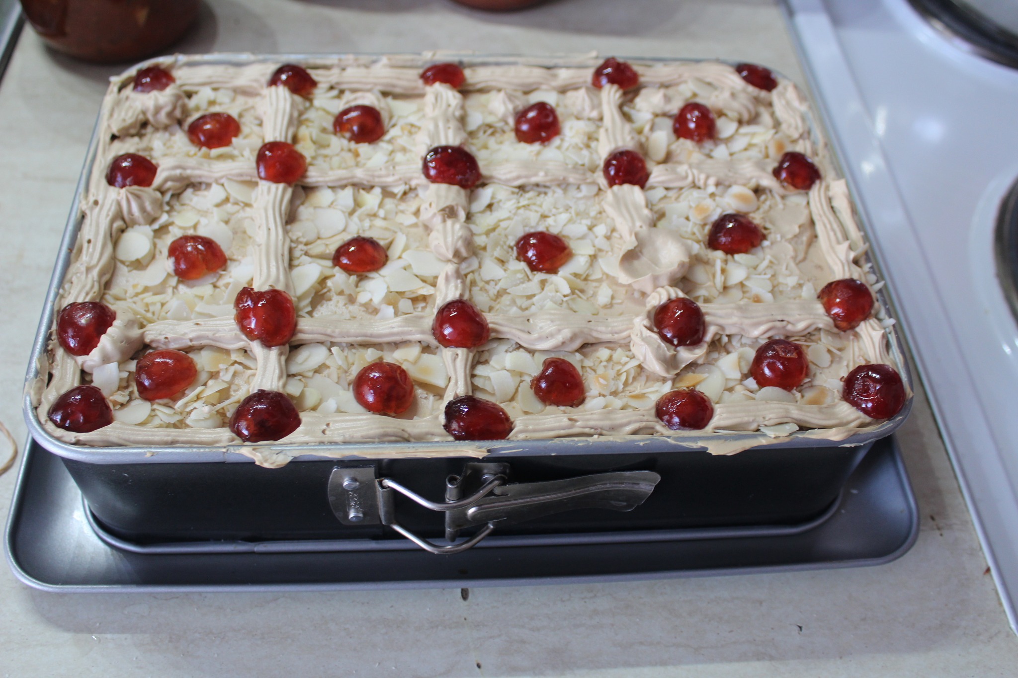 Στο τέλος πασπαλίζουμε με τα αλεσμένα αμύγδαλα, γαρνίρουμε με σαντιγί και βάζουμε κερασάκια γλασέ ή τη διακοσμούμε ανάλογα με τις προτιμήσεις μας.
