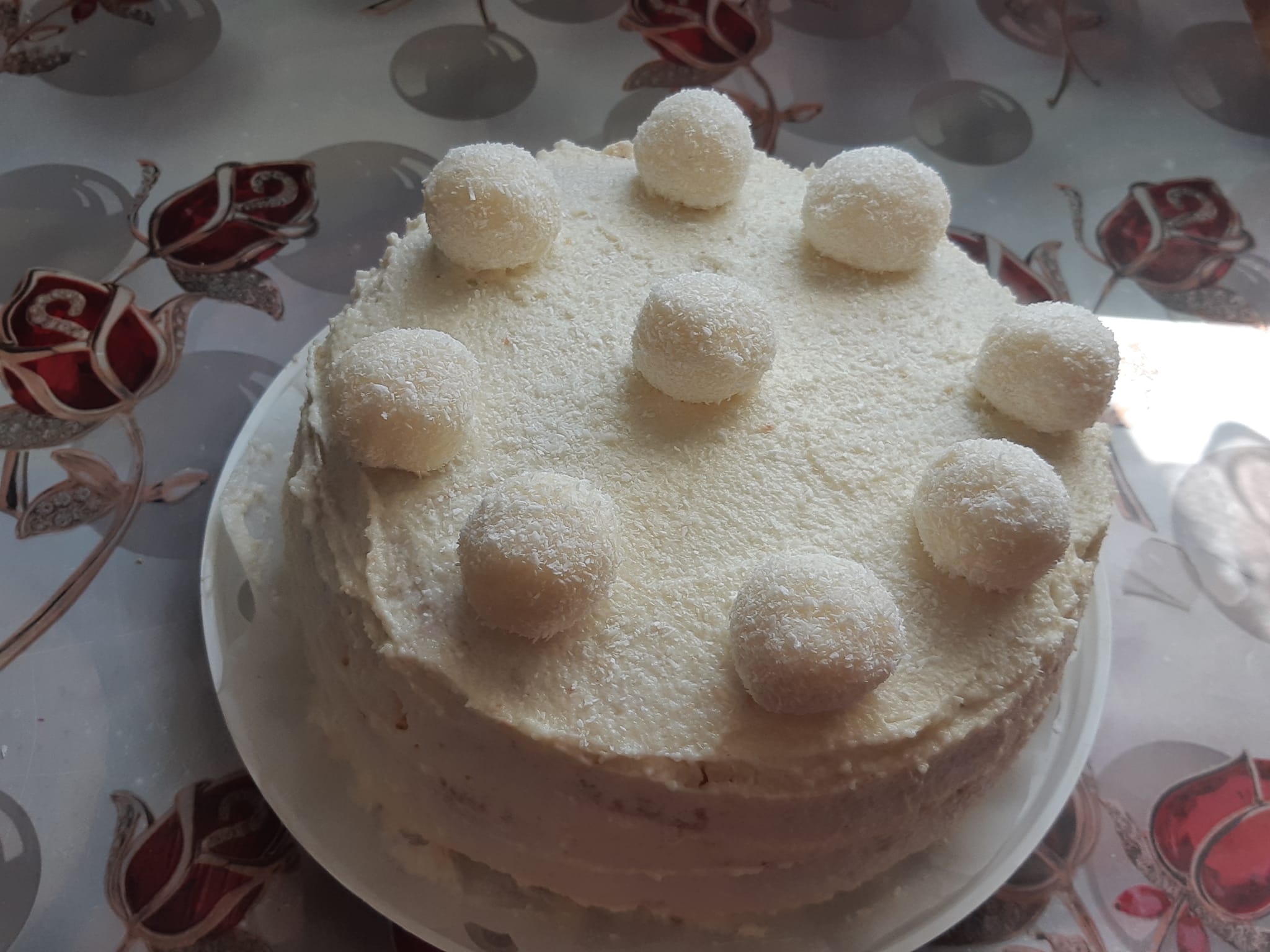 Απλώνουμε από όλες τις πλευρές με κρέμα και πασπαλίζουμε πυκνά με νιφάδες καρύδας.
