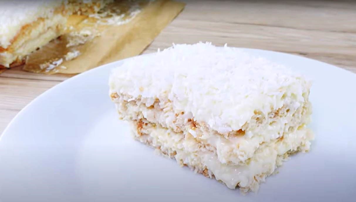 Πασπαλίζουμε από πάνω με τριμμένη καρύδα να το σκεπάσουμε εντελώς και το βάζουμε στο ψυγείο για 4 ώρες βγάζουμε το γλυκό μας από το ταψάκι αφαιρούμε τη λαδόκολλα και είναι έτοιμο να το σερβίρουμε