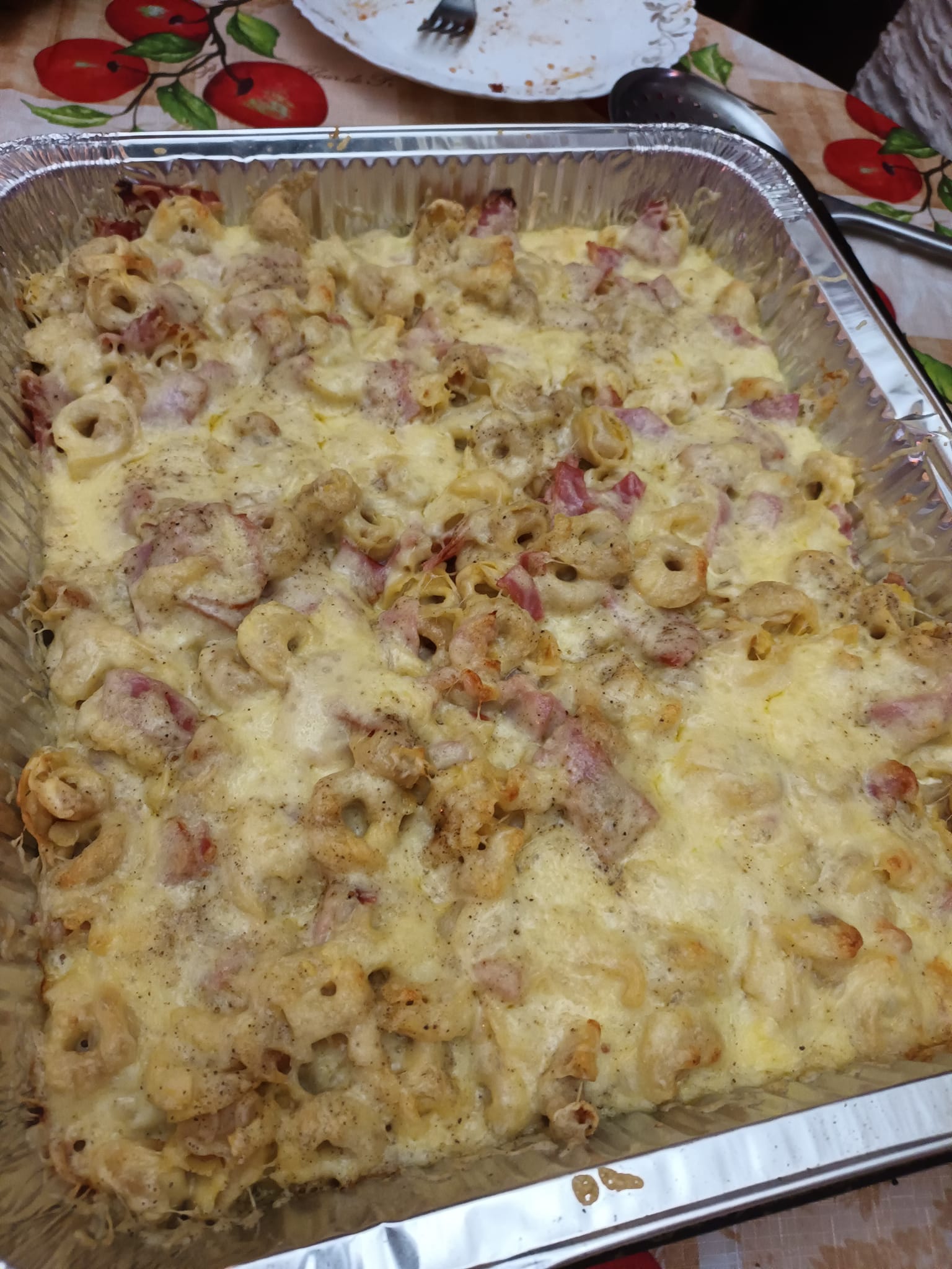 Εχω ανακατεψει τα τορτελινια με κοματακια το μπεικον και το ζαμπον και τα μισα τυρια,λιγο πιπερακι