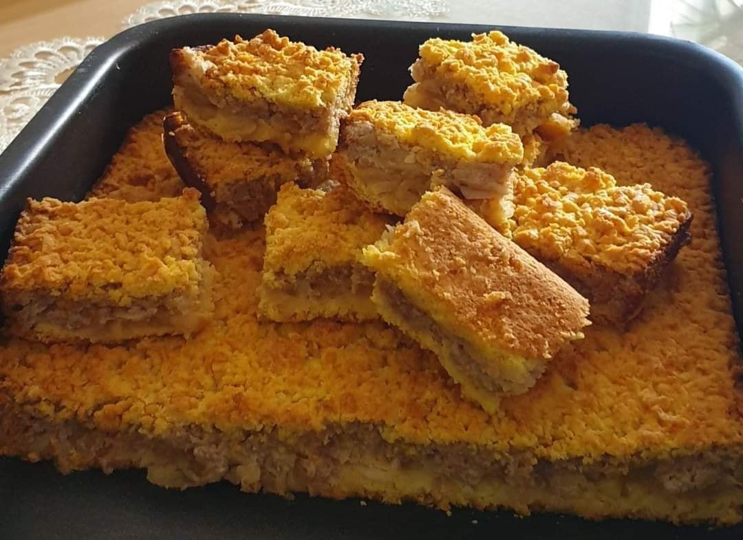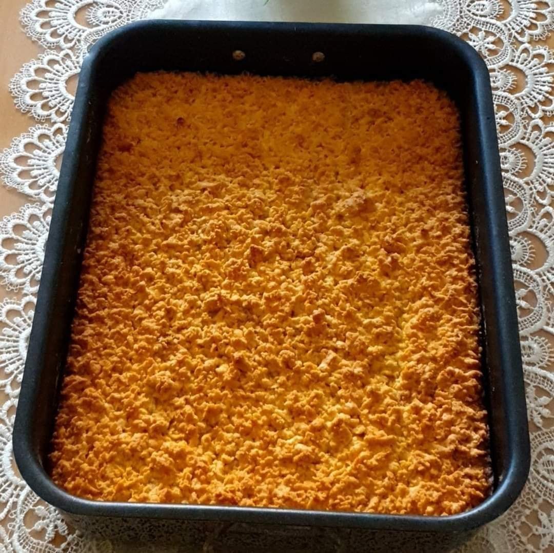 4. Βάζουμε στο πρώτο μέρος της ζύμης τριμμένα καθαρισμένα μήλα, μετά ρίχνουμε τη γέμιση και μετά τρίβουμε το δεύτερο μέρος της ζύμης από την κατάψυξη.