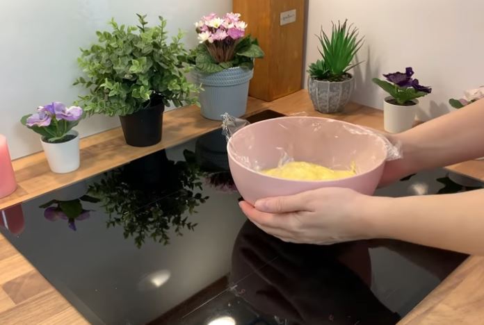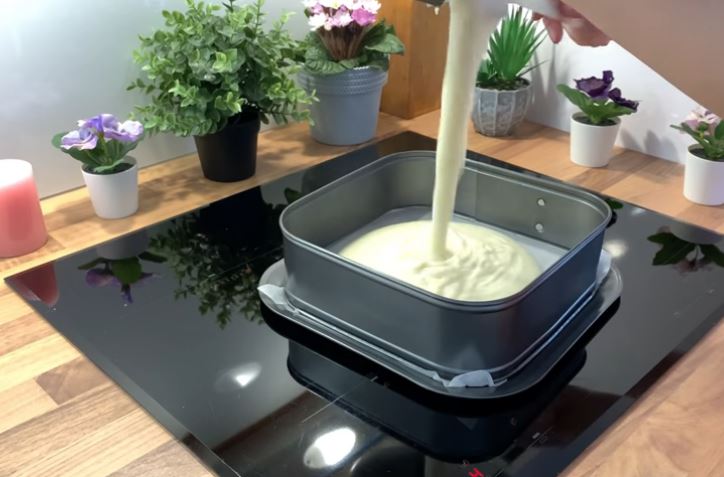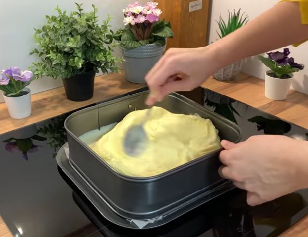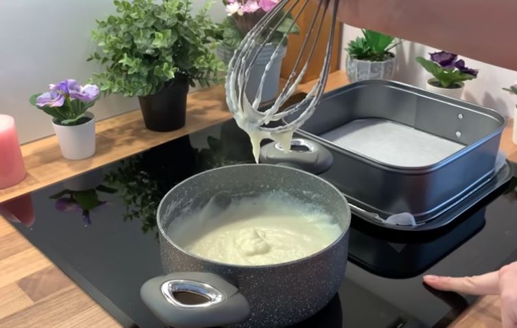 Σ ένα τετράγωνο μικρό ταψί βάζουμε αντικολλητικό χαρτί και ρίχνουμε την κρέμα μας ζεστή και το αφήνουμε στη άκρη.