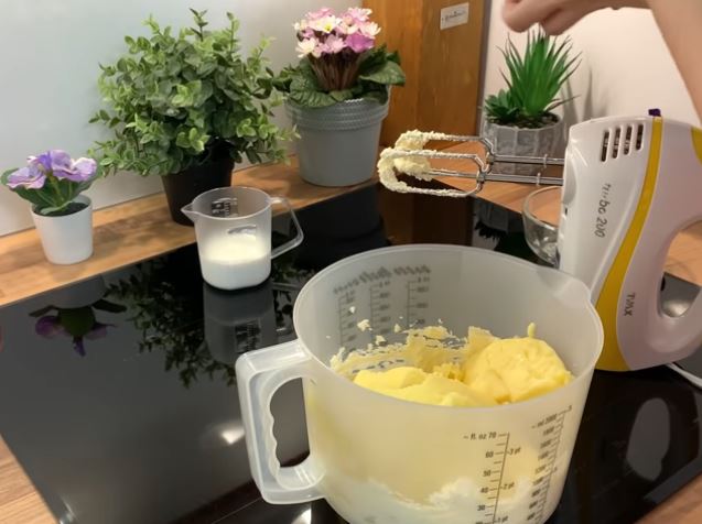 Χτυπάμε την μαργαρίνη με το μίξερ ν αφρατέψει ρίχνουμε την κρέμα βανίλια και την κρέμα γάλακτος (75γρ) και συνεχίζουμε το χτύπημα.