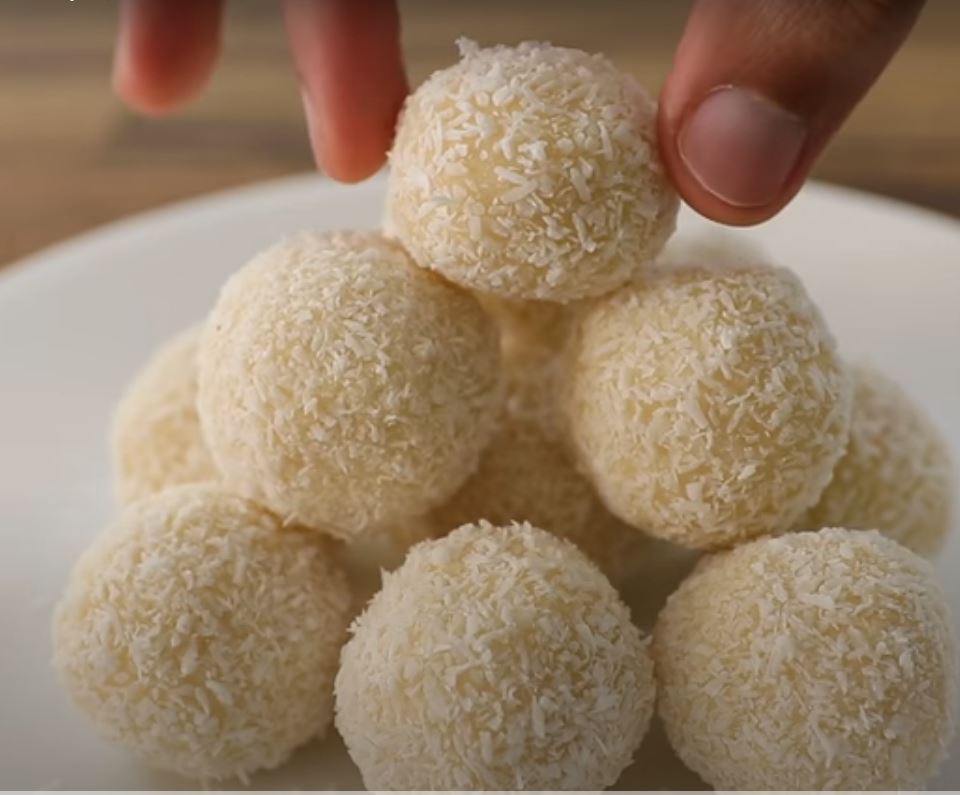 5. Διαμορφώστε το μείγμα σε μικρές μπάλες και κυλιστε σε αποξηραμένη / τριμμένη καρύδα.