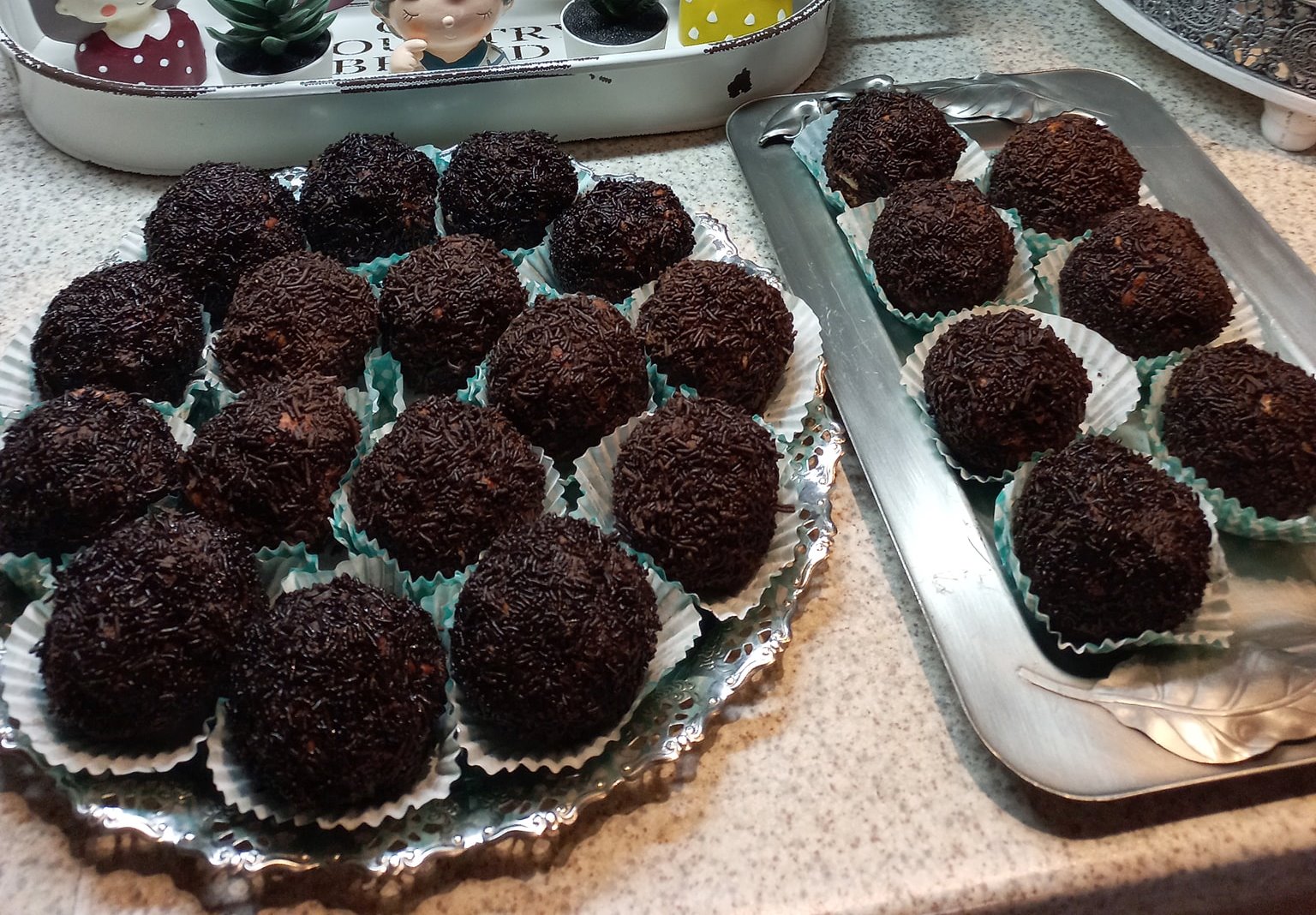 Όταν το μείγμα είναι αρκετά σφιχτό, το βγάζετε και σχηματίζετε μικρές μπάλες. Τυλίξτε τις τελειωμένες μπάλες σε κακάο.