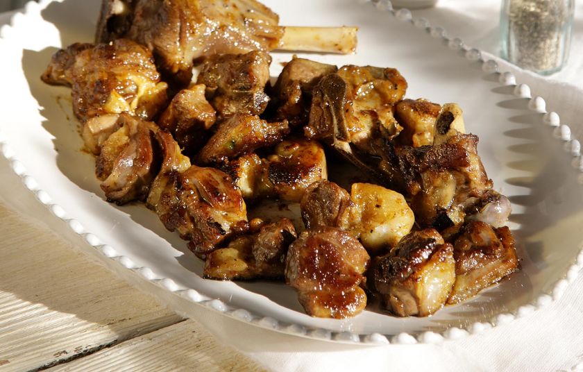 - 1½ κιλό κατσικάκι ή αρνάκι (χρειαζόμαστε κομμάτια μετρίως λιπαρά αλλά όχι άπαχα – μπορούμε να διαλέξουμε οποιοδήποτε μέρος του ζώου από το λαιμό μέχρι το μπούτι· ζητάμε από τον κρεοπώλη να μας τεμαχίσει το κρέας με το κόκαλο σε κομματάκια περίπου 4 εκ.)