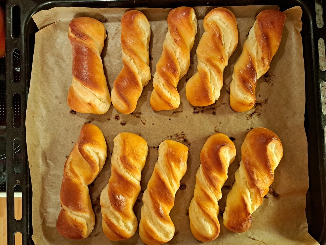 Διπλώνω τις μακριες πλευρες στο κεντρο και κόψτε τη ζύμη σε λωρίδες 3-4 εκ και καντε 2 συστροφές για να σχηματίσετε τα τσουρέκια. Τοποθετήστε τα σε ένα ταψί στρωμένο με λαδόκολλα.