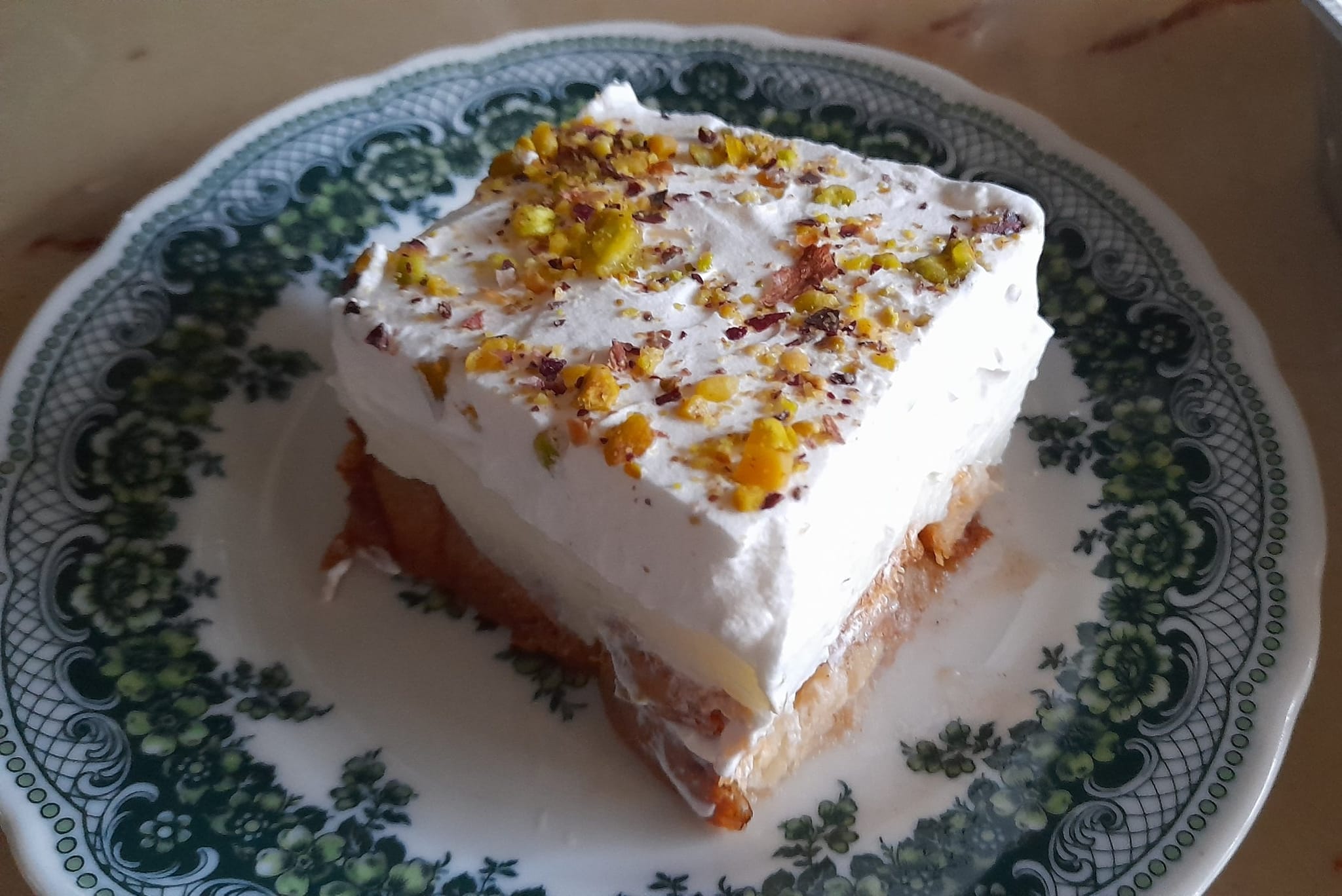 Φτιάχνω τη σαντιγί μου ανακατεύοντας το γάλα με το περιεχόμενο των φακέλων και απλώνω πάνω από το γλυκό που έχει στο μεταξύ κρυώσει. Πασπαλιζω με τριμμένο φυστίκι Αιγινης.