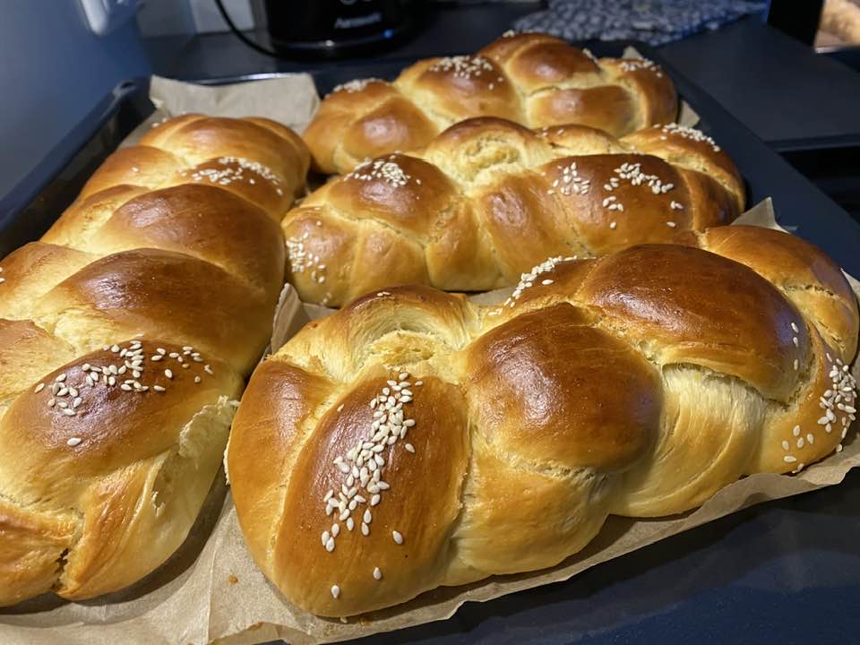 Πλάθω τα τσουρέκια και τ αφηνω 20-30′ σε ζεστο μερος να φουσκωσουν. Τ’αλείφω με αυγό, πασπαλίζω με σουσάμι αν θέλω.