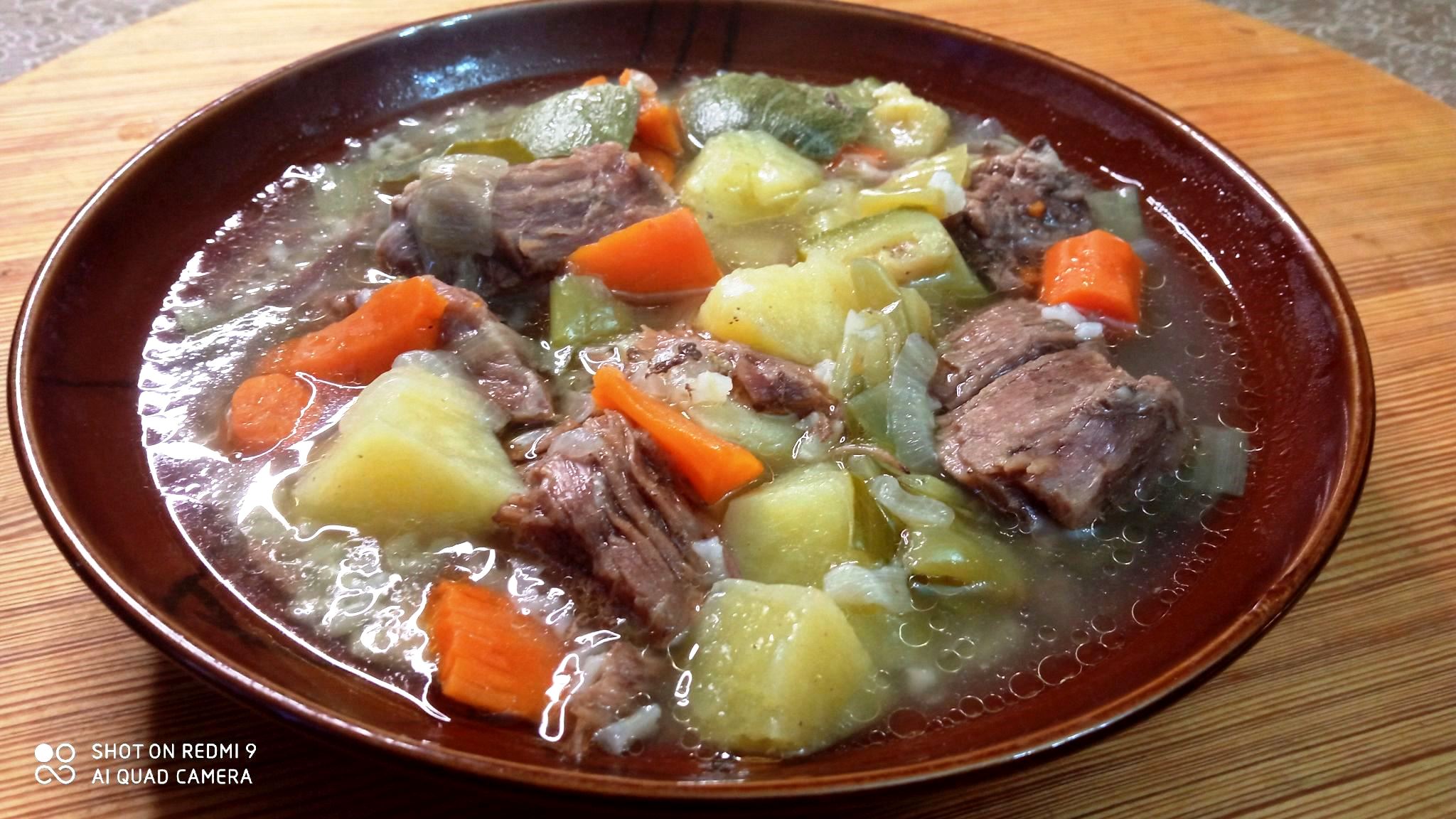 Στο υπόλοιπο κρέας και ζωμό , προσθέστε το κρεμμύδι , το πράσο , το καρότο , την πιπεριά , την πατάτα και το κολοκύθι .