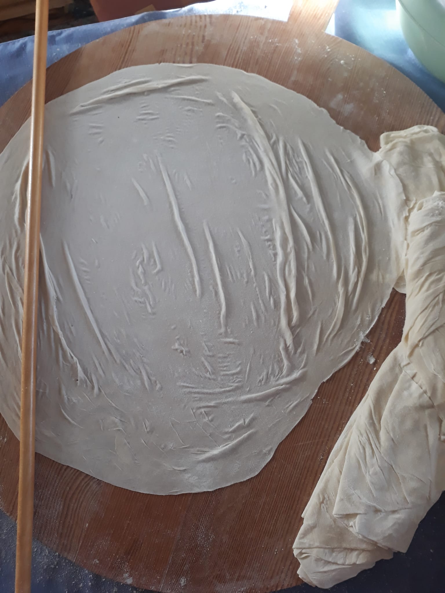 Χωρίζουμε την ζύμη στα τέσσερα και με τον πλάστη ανοίγουμε τα φύλλα σε αλευρωμένη επιφάνεια.