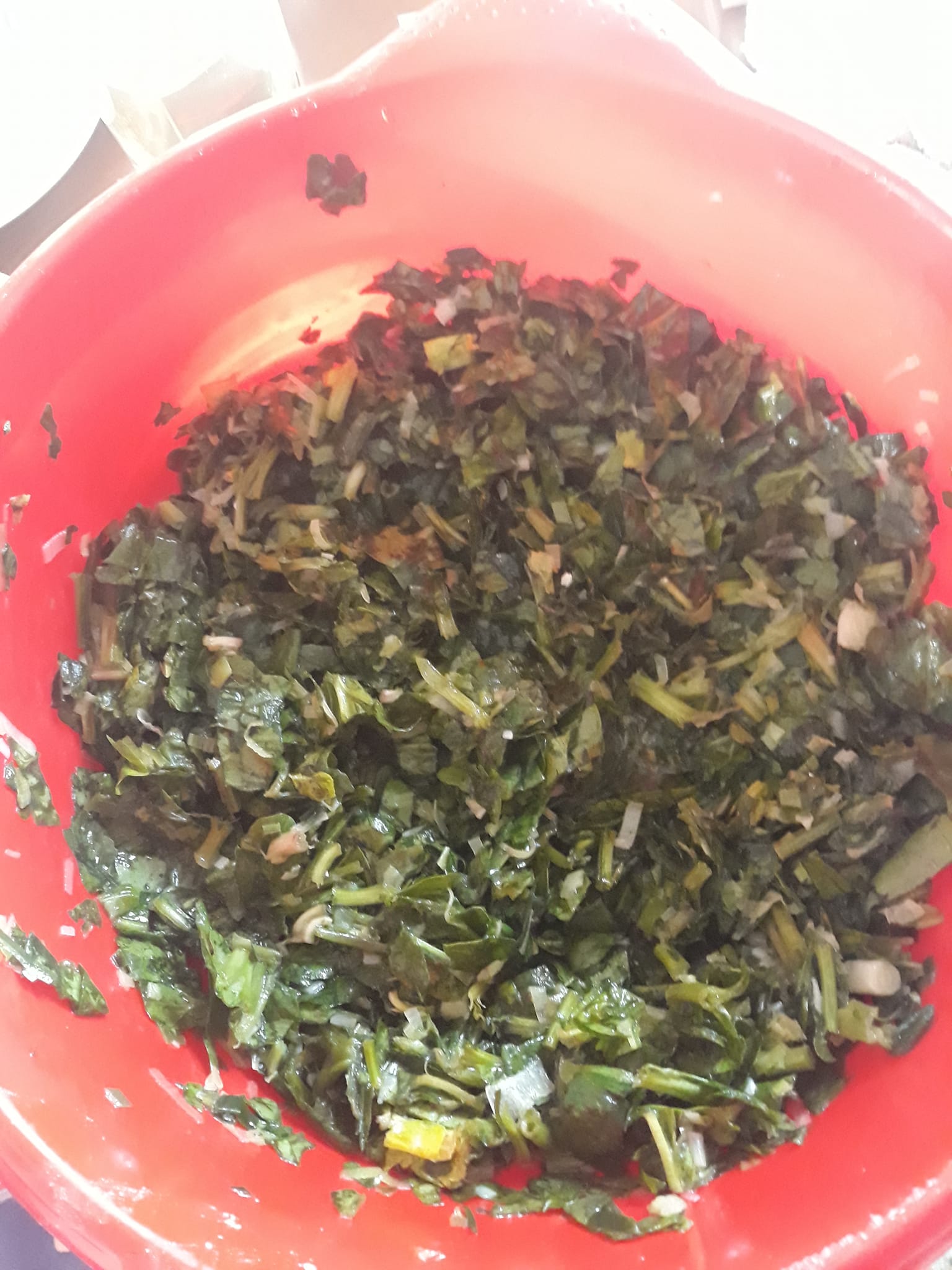 Σουρώνουμε τα χόρτα, τα στύβουμε καλά και τα ψιλοκόβουμε.