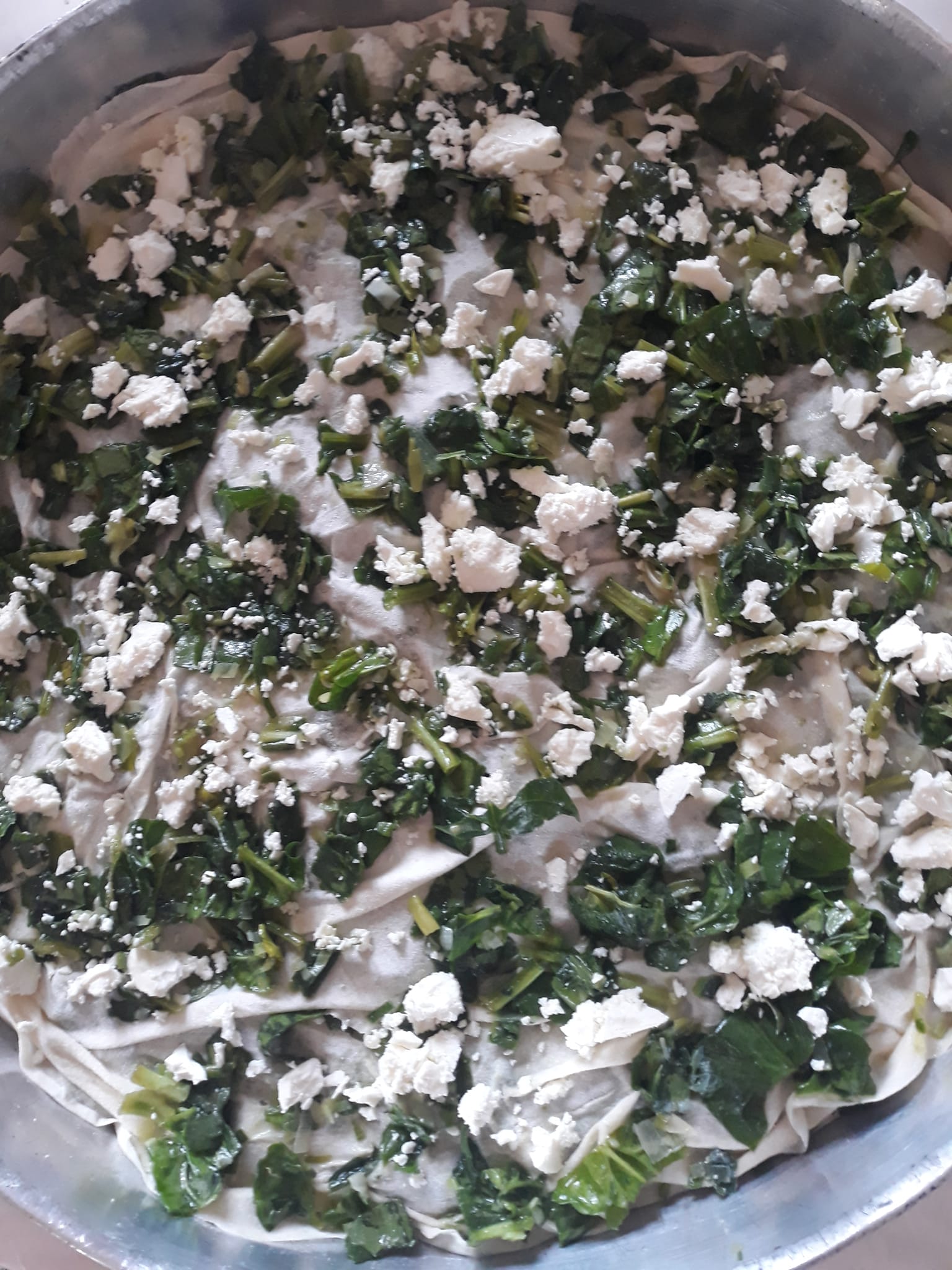 Τοποθετούμε τη γέμιση και την στρώνουμε με το κουτάλι να καλύψει όλη την επιφάνεια και , τριβουμε την φέτα.
