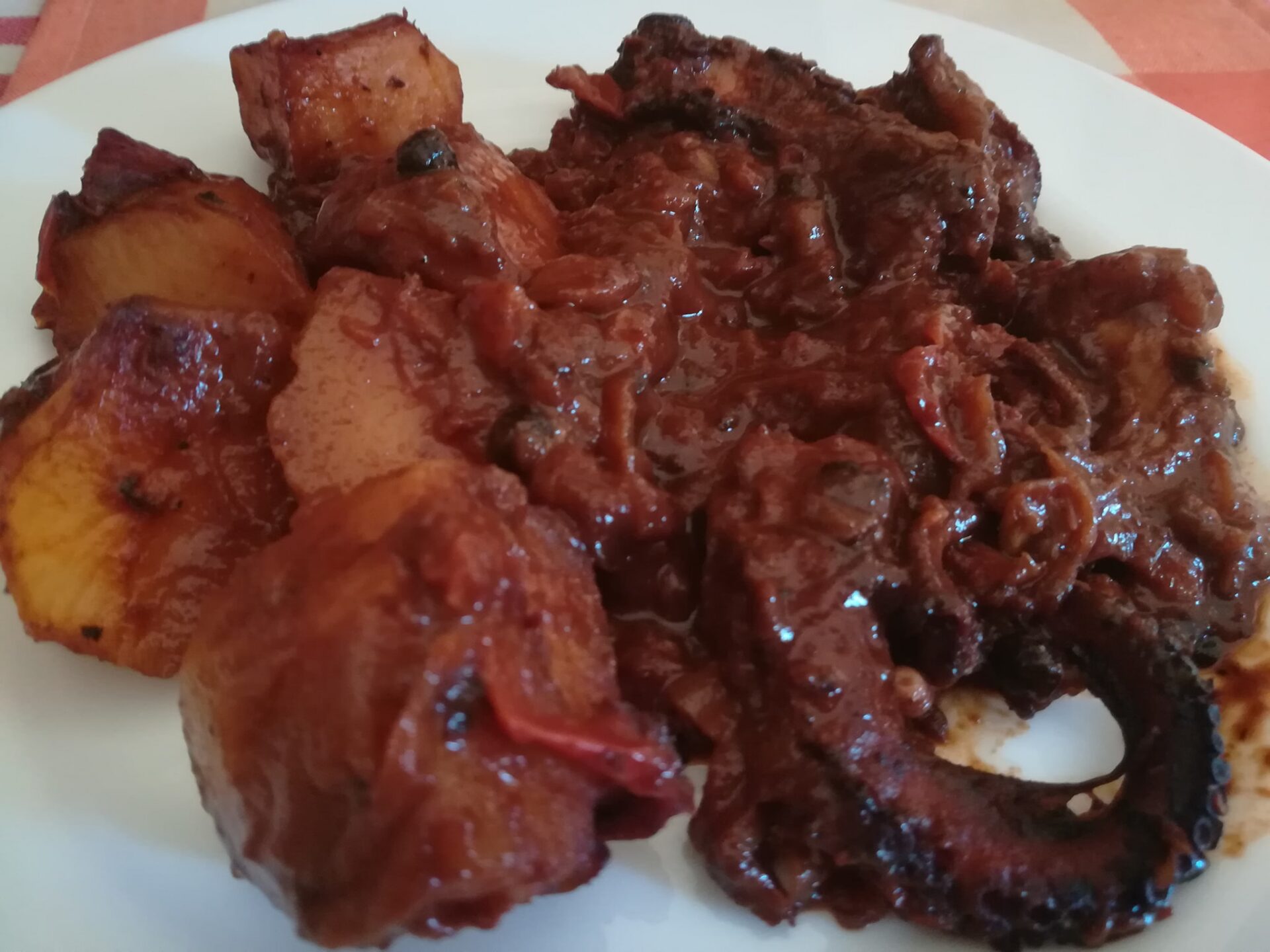 Όταν το τηγάνι είναι έτοιμο προσθέτετε 2-3 κουταλιές της σούπας ελαιόλαδο, το κρεμμύδι, το χταπόδι, τις σκελίδες σκόρδου, λίγο αλατοπίπερο και σοτάρουμε μέχρι να πάρουν χρώμα, περίπου 5-7 λεπτά, προσθέτουμε το ξύδι και μετά από ένα λεπτό το κρασί.
