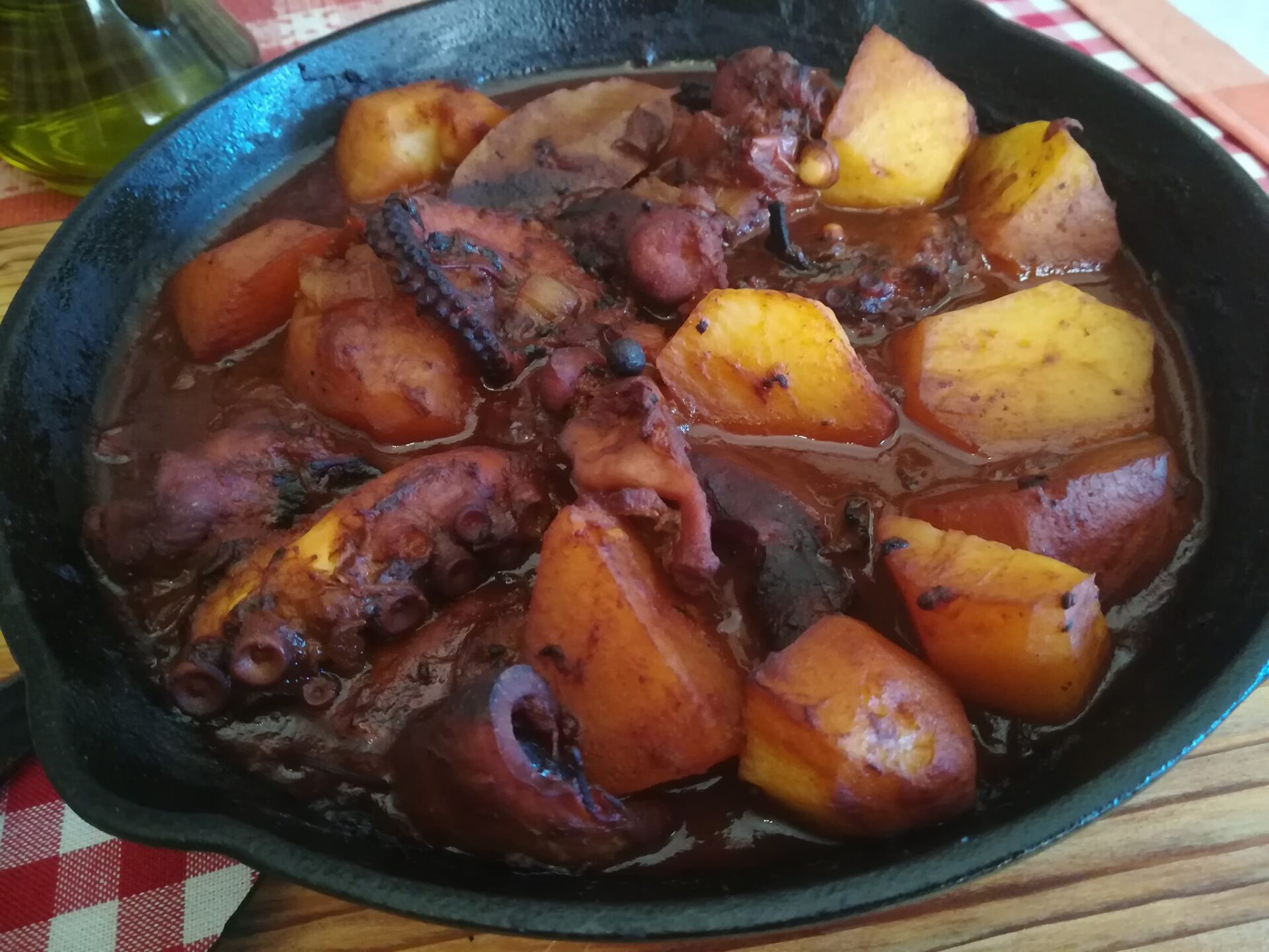 Όταν το τηγάνι είναι έτοιμο προσθέτετε 2-3 κουταλιές της σούπας ελαιόλαδο, το κρεμμύδι, το χταπόδι, τις σκελίδες σκόρδου, λίγο αλατοπίπερο και σοτάρουμε μέχρι να πάρουν χρώμα, περίπου 5-7 λεπτά, προσθέτουμε το ξύδι και μετά από ένα λεπτό το κρασί.