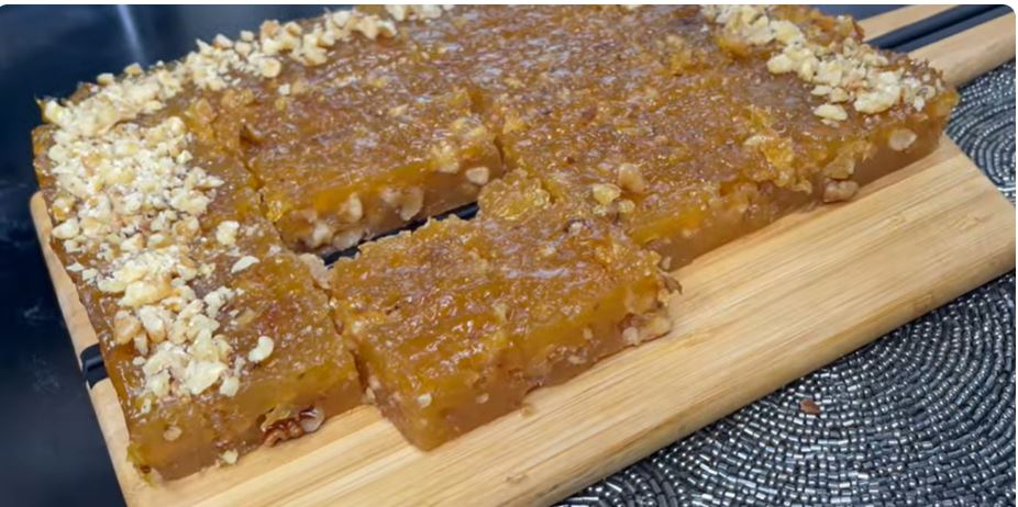 Γαρνίρουμε με τριμμένα καρύδια κόβουμε και σερβίρουμε.