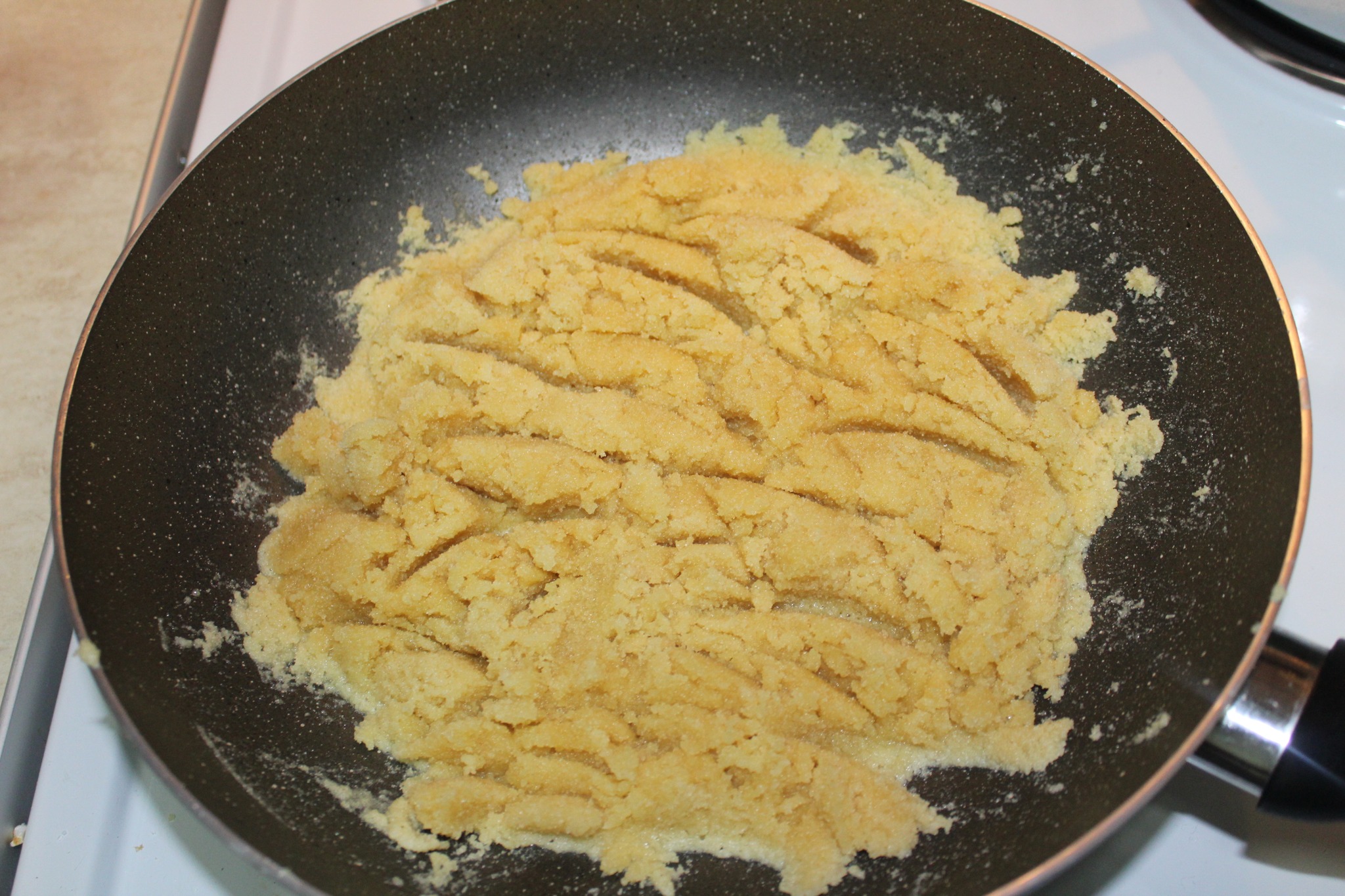 Τσιγαρίζω το σιμιγδάλι στο λάδι σε μέτρια φωτιά, μέχρι να πάρει χρυσαφί χρώμα και προσέχουμε να μήν αρπάξει.