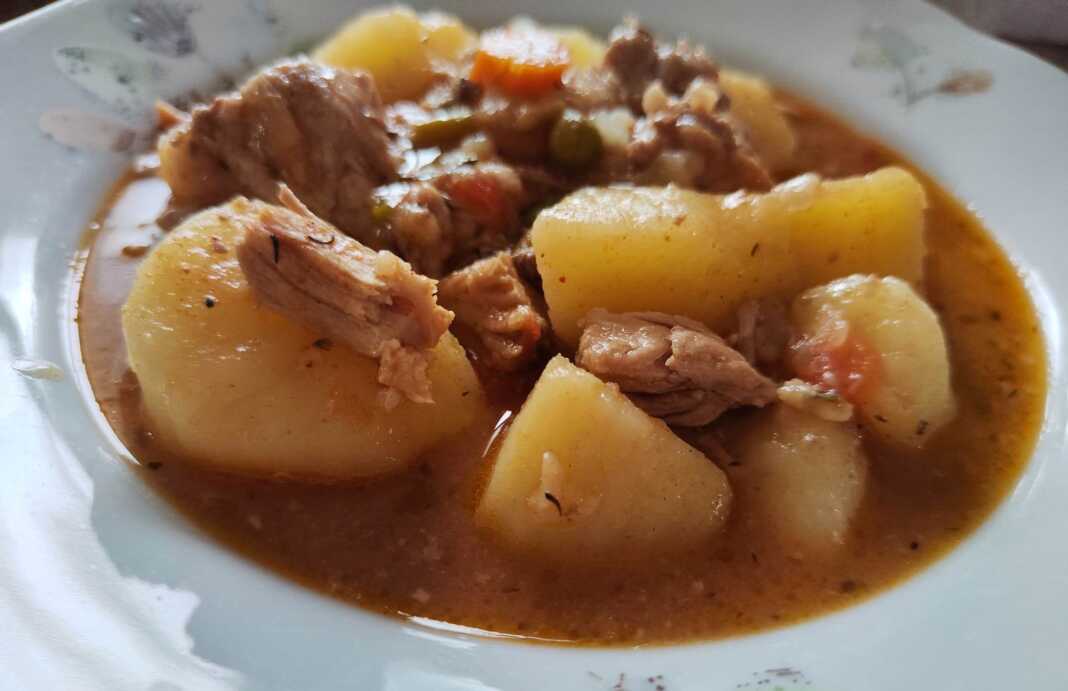Ζεσταίνετε το λάδι με το βούτυρο σε καθαρό σκεύος, προσθέτετε τα λαχανικά (εκτός απ’ τις πατάτες) και το κρέας και σοτάρετε έως ότου το κρέας πάρει χρώμα και τα λαχανικά μαραθούν. Στη συνέχεια σβήνετε με κρασί, ρίχνετε τον κύβο και ανακατεύετε έως ότου διαλυθεί και μειωθούν τα υγρά.