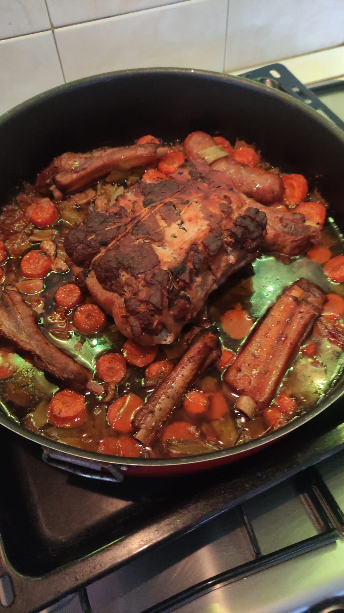 Μετα το βάζω σε ένα ταψάκι με ολα τα υγρά του περιχύνω με κρασί, προσθέτω τα καρότα, κρεμμύδι και σέλινο χοντροκομμένα, 300-500 ml ζωμό λαχανικών και ψήνω στους 180°