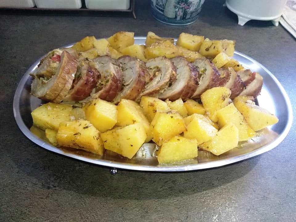 Κατοπιν το διπλωνουμε με προσοχη σε ρολο και με την σακοραφα αρχιζουμε να το ραβουμε καλα ωστε να κλεισουμε ολα τα ανοιγματα για να εγκλωβισουμε την γεμιση να μην μας αδειασει στο ψησιμο.(καλο ειναι να το ετοιμασετε απο το προηγουμενο βραδυ να το βαλετε στο ψυγειο και την αλλη μερα να το ψησετε.