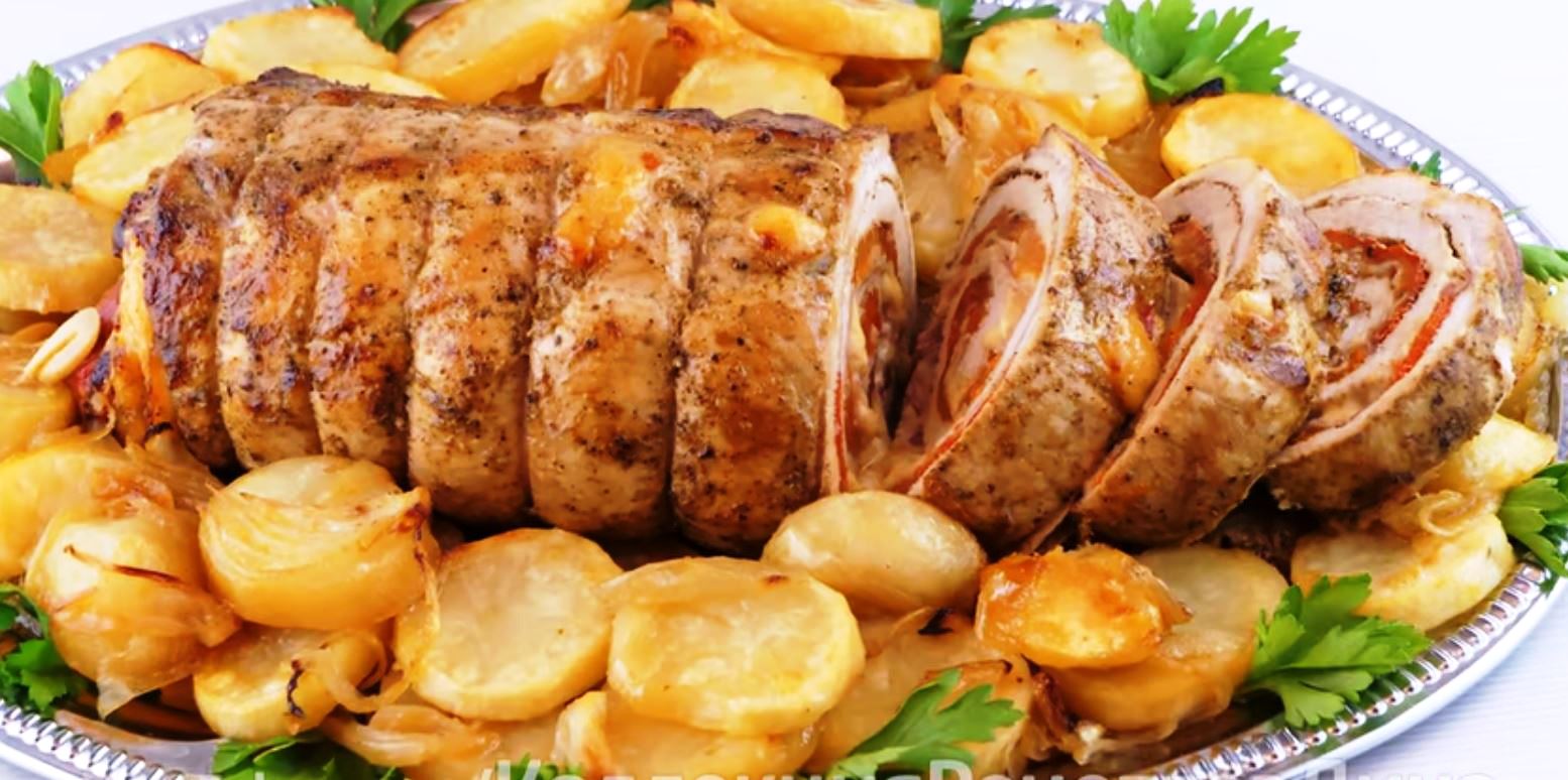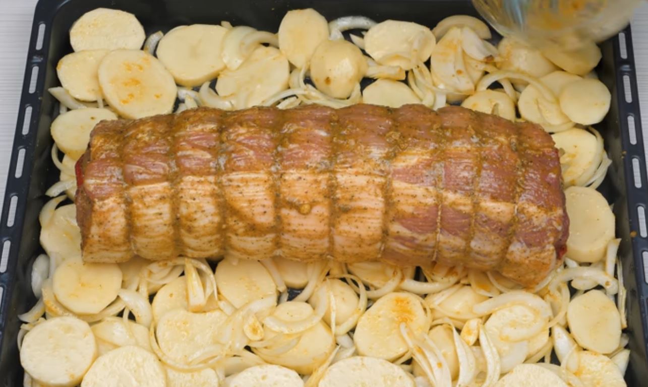 Κόβπυμε τις πατάτες σε ροδέλες και τις βάζουμε στο ταψί και το σκόρδο το κρεμμύδι χοντροκομμένο και τα βάζουμε όλα μαζί στο ταψί με λάδι και ρίγανη από πάνω βάζουμε το ρολό το οποίο το αλείφουμε με τη μαρινάδα που έχουμε φτιάξει.