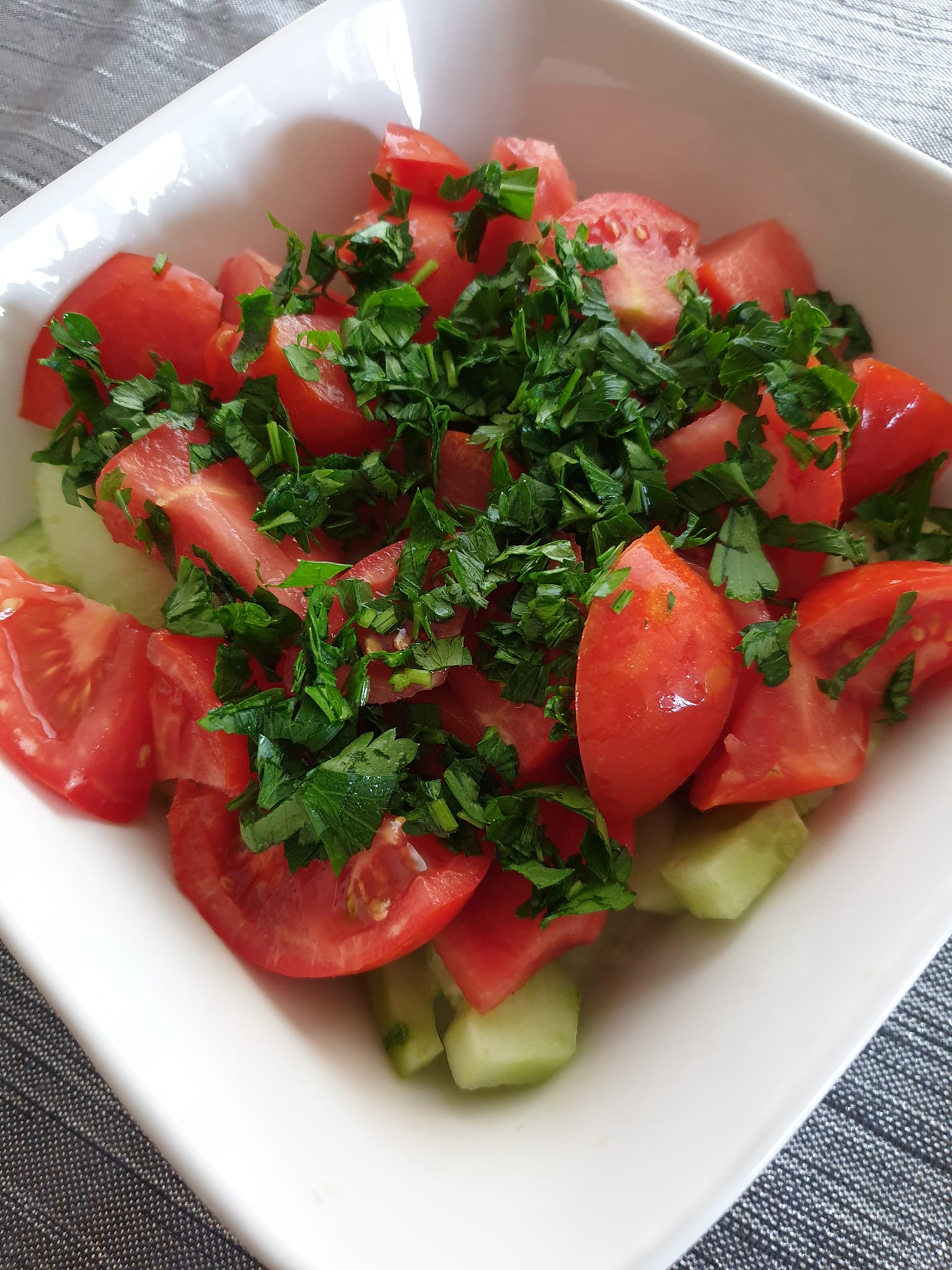 και μία Σαλάτα με ντομάτα, αγγούρι, κρεμμύδι και μαϊντανό.
