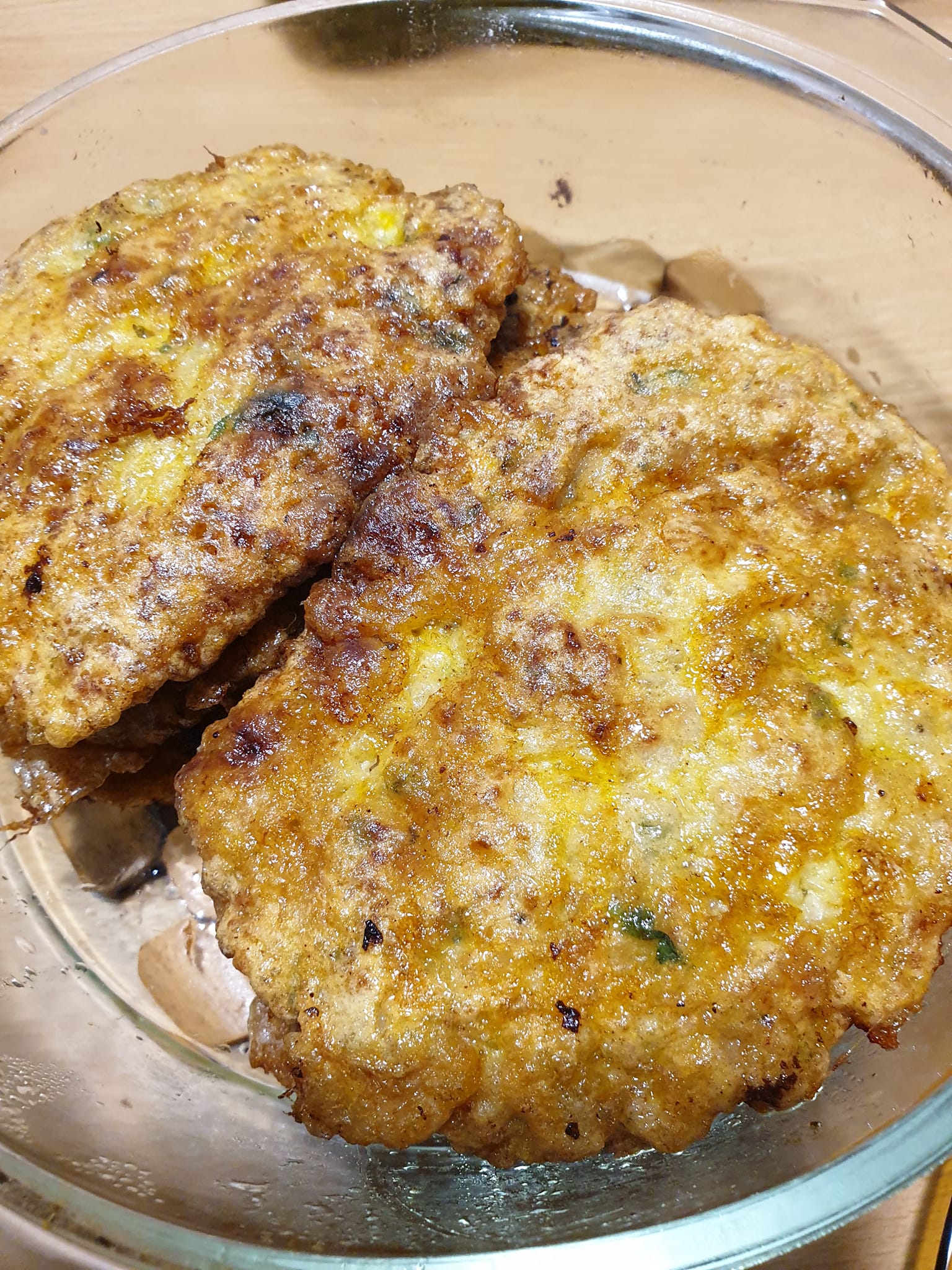 Επλάσα τα σνίτσελ, τα κύλησα σε αλεύρι, τα βούτηξα σε χτυπημένα αυγά και τα τηγάνισα
