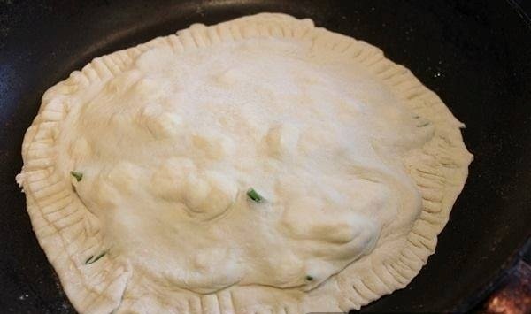 Καλύπτουμε με την άλλη ζύμη, ενώνουμε τις άκρες με τα δάχτυλα και ένα πιρούνι και τηγανίζουμε σε τηγανι με πολυ ελάχιστο λαδι με μέτρια φωτιά τηγάνι.