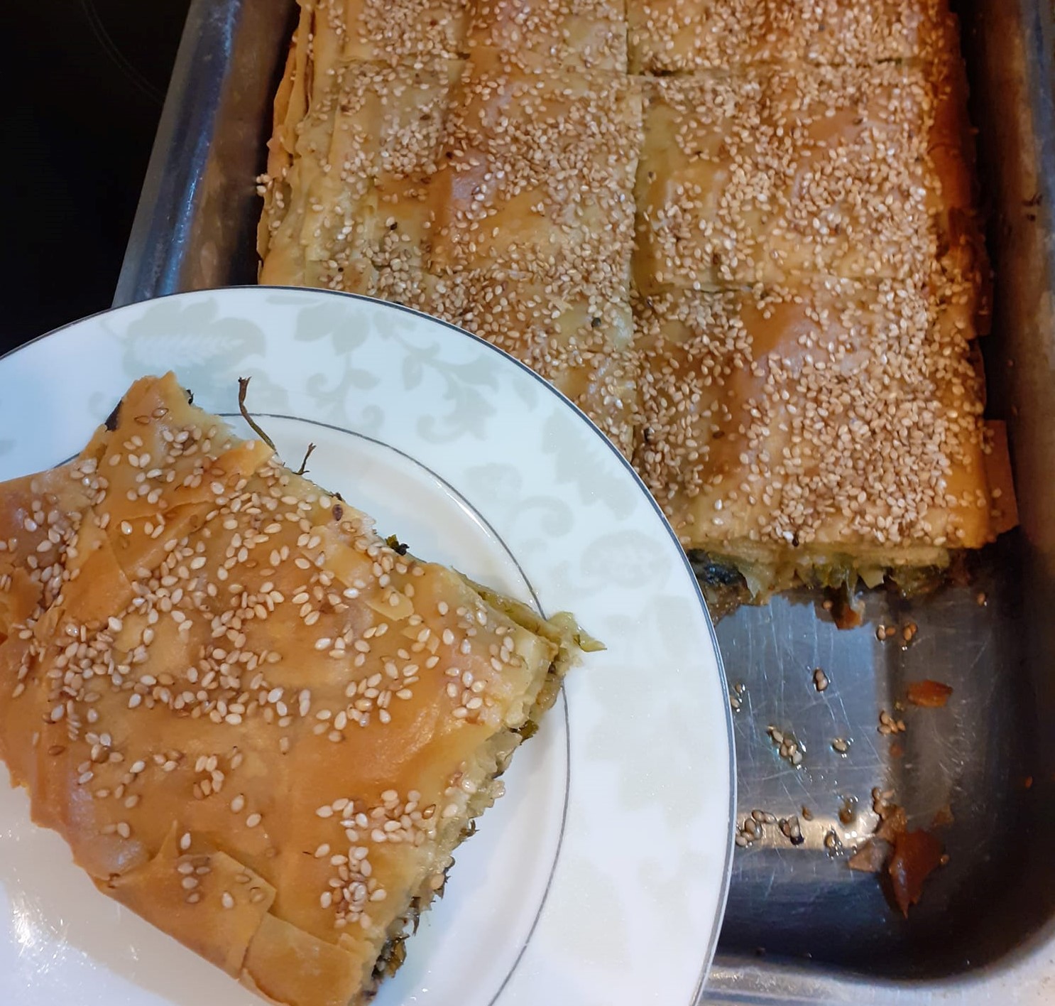 Έστρωσα τα μισά κάτω λαδώνοντας καλά Έβαλα το μείγμα το Έστρωσα και έβαλα τα υπόλοιπα φύλλα λαδωμένα και αυτά καλά χάραξα την πίτα τη πέρασα με λάδι και νερό και έριξα από πάνω σουσάμι την έψησα στους 170 βαθμούς περίπου για 40 λεπτά