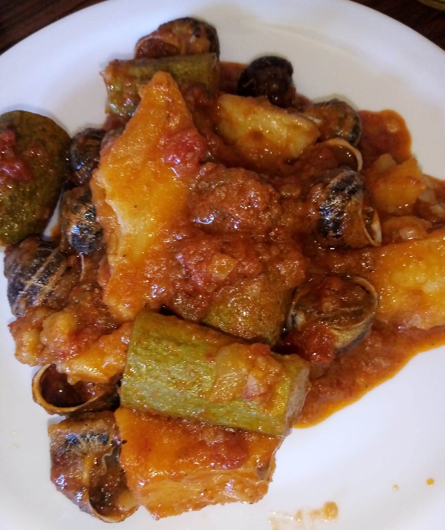 Αυτό το κρητικό πιάτο είναι μια πραγματική γευστική εμπειρία, γεμάτη με φρέσκα καλοκαιρινά υλικά και πλούσια αρώματα. Τα σαλιγκάρια, πλούσια σε πρωτεΐνη και σίδηρο, δίνουν στο φαγητό μια ιδιαίτερη νοστιμιά, ενώ τα κολοκυθάκια και οι πατάτες προσθέτουν όγκο και γήινη γεύση. Η σάλτσα ντομάτας, αρωματισμένη με κρεμμύδι, σκόρδο και μυρωδικά, δένει όλα τα υλικά άψογα, δημιουργώντας ένα πιάτο γευστικό και χορταστικό.