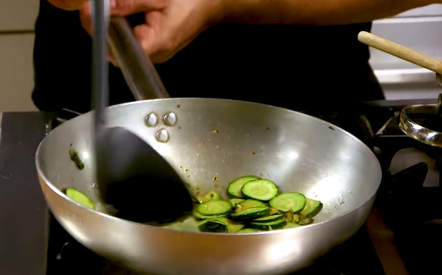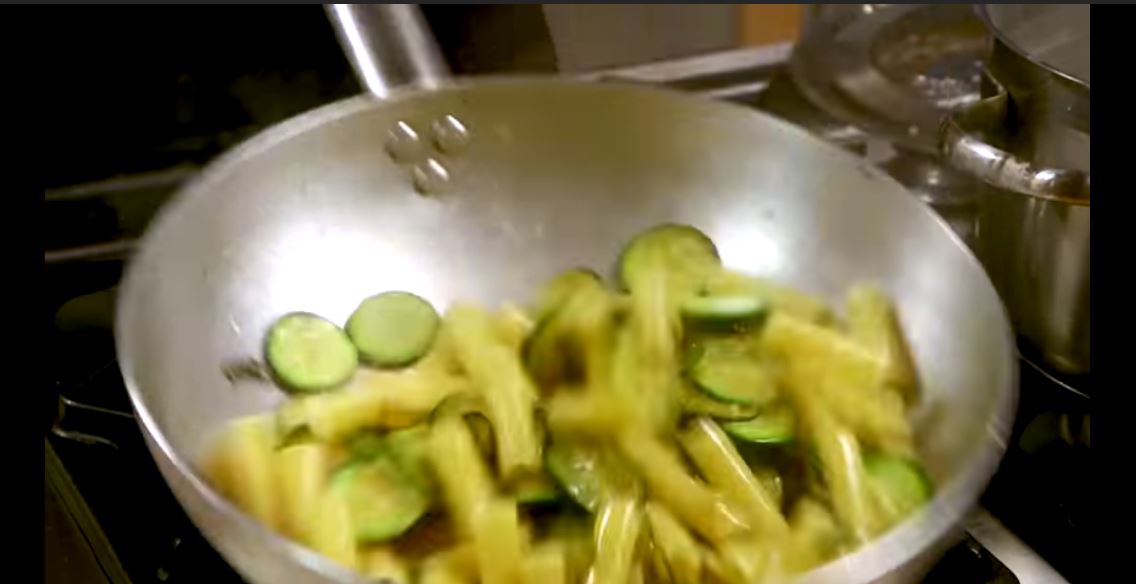 Στραγγίξτε τα ζυμαρικά και ρίξτε τα στο τηγάνι με τα κολοκυθάκια και προσθέστε μερικές κουτάλες από το νερό μαγειρέματος λίγο κάθε φορά και συνεχίστε το μαγείρεμα.