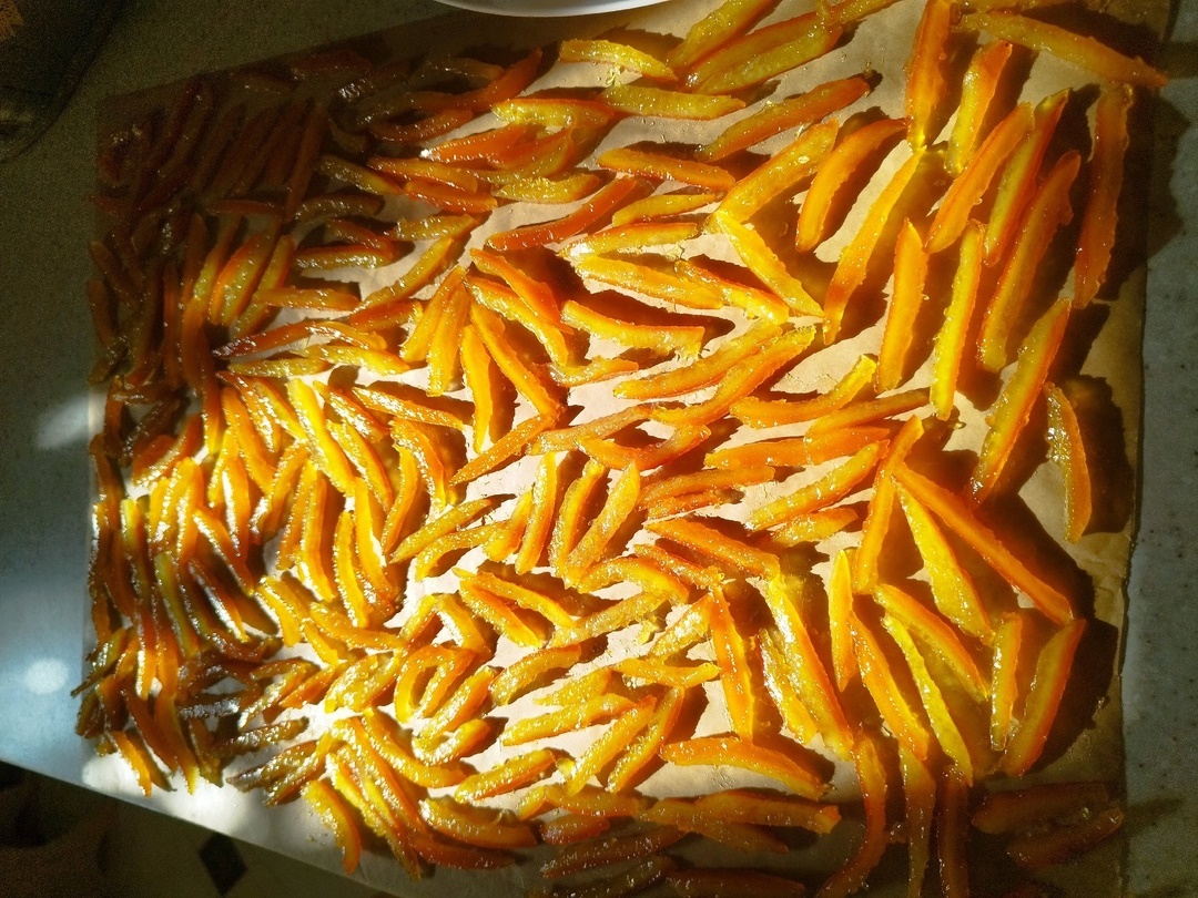 Αφαιρέστε τις φλούδες από το σιρόπι και απλώστε τις σε ένα ταψί στρωμένο με αντικολλητικό χαρτί.