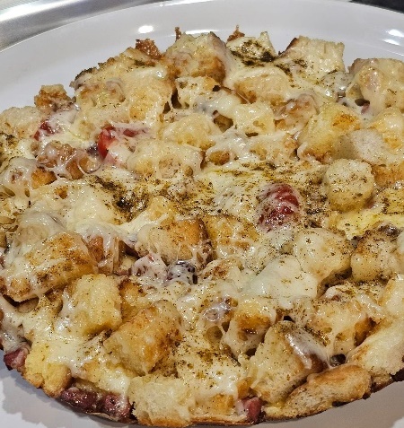 Τοποθετούμε τις 3 φέτες ψωμί σε ένα πυρέξ. Τις τρυπάμε με τη βοήθεια ενός πιρουνιού ώστε να απορροφήσουν περισσότερο από το μείγμα.