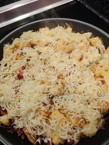 ανακάτεψακαι έριξα 3 αυγά χτυπημένα με 50 ml φρέσκο γάλα. Όταν τα αυγά είχαν “δέσει”, τα πασπάλισα με τριμμένο τυρί