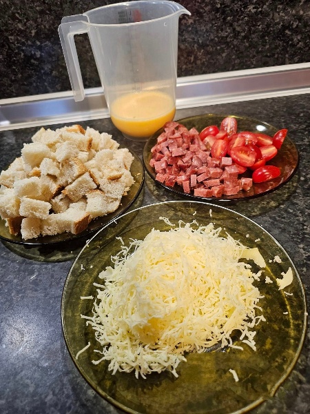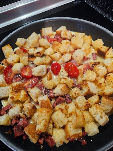 Έκοψα τις φέτες ψωμί σε κύβους (όπως για κρουτόν), ζαμπόν ή λουκάνικο και ντοματίνια κομμένα στην μέση.