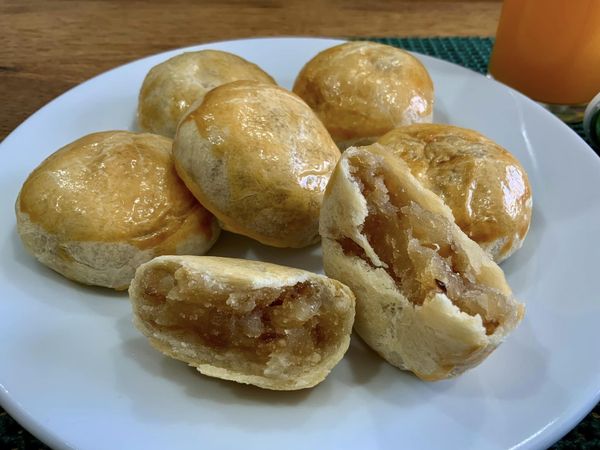 Προθερμάνετε τον φούρνο στους 180°C. Χωρίστε τη ζύμη σε 12 ίσα μέρη. Πλάθετε κάθε κομμάτι ζύμης σε μπαλάκι. Ανοίξτε κάθε μπαλάκι σε στρογγυλό φύλλο με διάμετρο περίπου 10 cm. Βάλτε 1 κουταλιά της σούπας από τη γέμιση στο κέντρο κάθε φύλλου. Διπλώστε τις άκρες του φύλλου προς τα πάνω για να κλείσετε τη γέμιση. Πιέστε τις άκρες για να σφραγίσουν καλά.